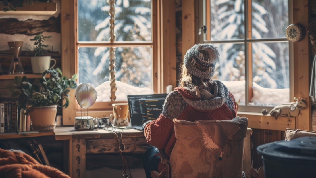 At home: Natural wood accents, stone textures, and oversized knit throws set the tone. Go bold with dark greens, weathered leather, and a fireplace (real or faux). A retreat-worthy update for your den or bedroom.
